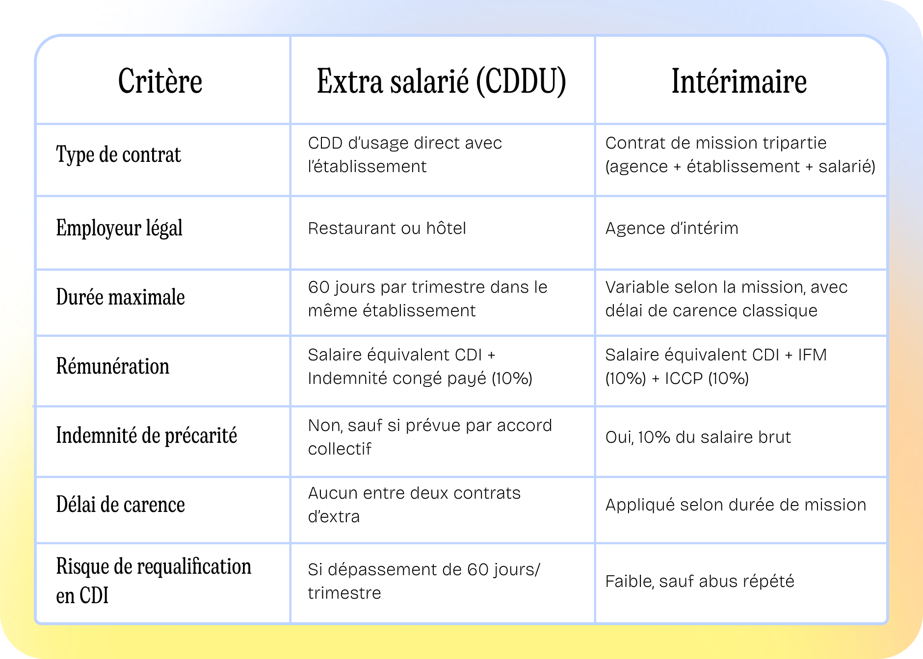 Maintenant que vous connaissez les spécificités de chaque statut, voici un tableau qui récapitule les écarts essentiels entre contrat d'extra et intérim dans la restauration.
